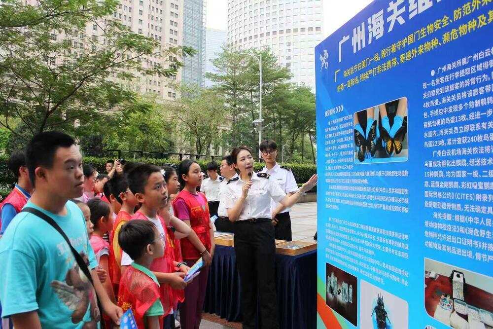 “大家看这只手掌大的甲虫,它的中文名叫长戟犀金龟,主要分布于中南美洲的热带雨林,是世界上最大的甲虫之一,目前在我国尚无自然分布,属于外来物种。”在外来物种展示区,一件件标本吸引了小朋友们的驻足观看。广州海关技术中心工作人员耐心地为小朋友们讲解外来物种给国家生态安全带来的危害,“如果它们扩散至野外,会因为缺少天敌制约,挤占本地物种的生存空间,从而可能导致本地物种减少,使本地生态系统受到冲击。”